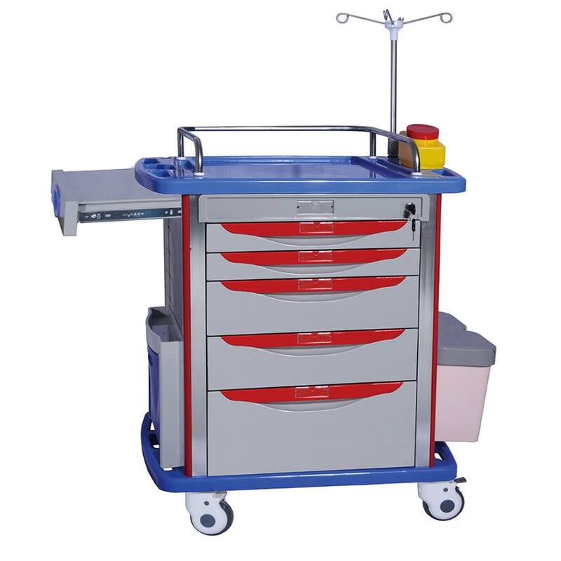 4.Equip with:defibrillator shelf,stretchable IV stand and sliding side shelf for writing,two trash cans,flexible material storage,needle disposal holder,back side:C.P.R board,5M power line,oxygen tank holder